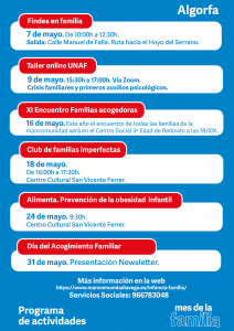 Talleres: Findes en familia: 7 de mayo/ Taller on line UNAF: 9 de mayo / IX Encuentro Familias acogedoras: El encuentro de todas las familias de los mancomunidad será el 16 de mayo en Redován./ Club de familias imperfectas: 18 de mayo /Alimenta. Prevención de la obesidad infantil: 24 de mayo / Día del Acogimiento Familiar 31 de mayo