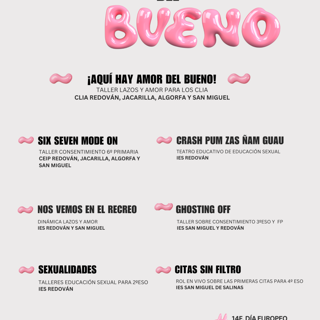 Entre las actividades previstas se encuentran talleres de consentimiento para alumnado de ESO y FP, sesiones de educación sexual responsable, propuestas específicas para Primaria a través del entorno de juego Roblox, una campaña participativa en los recreos bajo el lema “Aquí hay Amor del Bueno” y acciones teatrales y de rol en vivo que invitan a reflexionar sobre las primeras citas, las señales de alerta y la construcción de relaciones sanas.