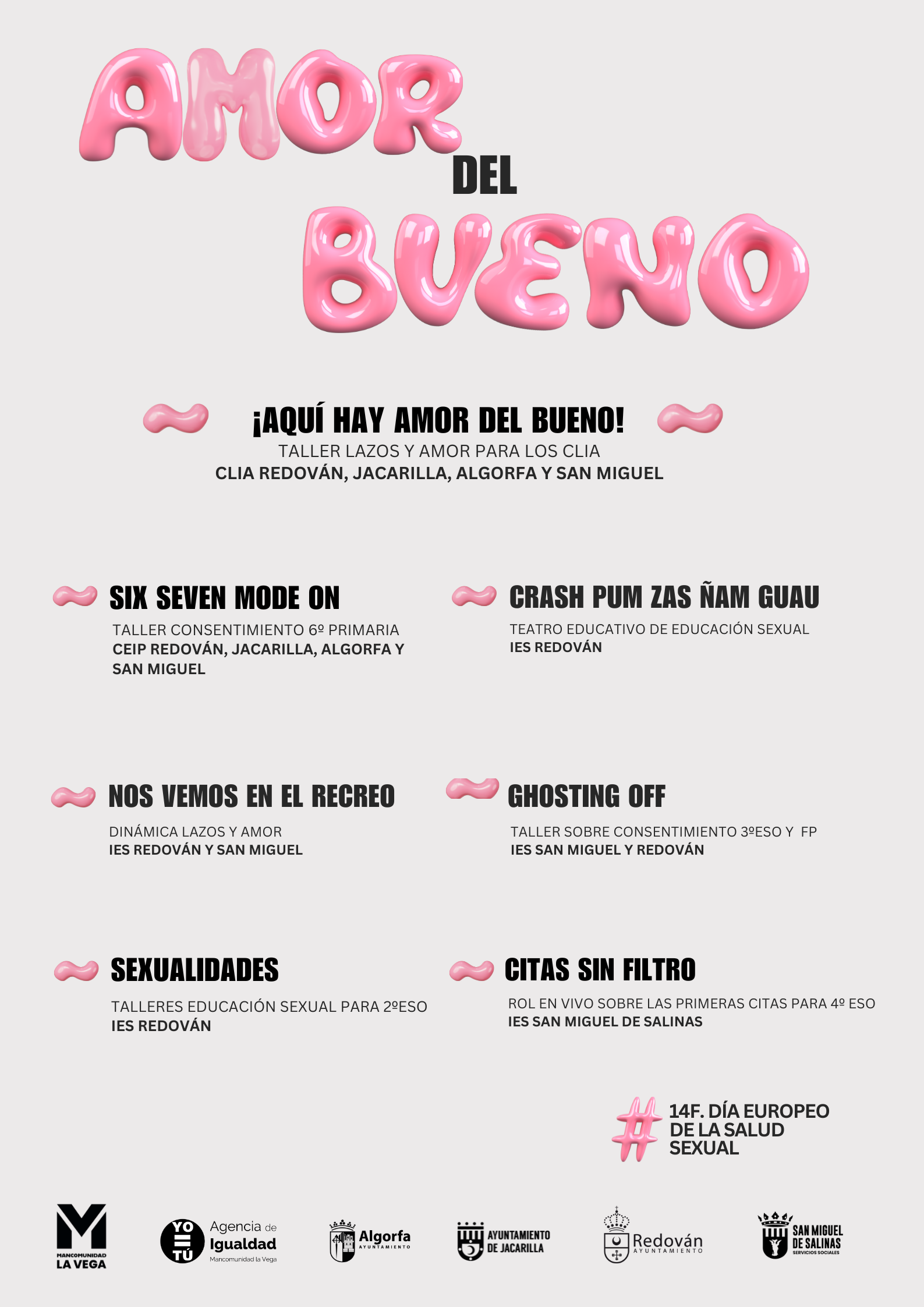 Entre las actividades previstas se encuentran talleres de consentimiento para alumnado de ESO y FP, sesiones de educación sexual responsable, propuestas específicas para Primaria a través del entorno de juego Roblox, una campaña participativa en los recreos bajo el lema “Aquí hay Amor del Bueno” y acciones teatrales y de rol en vivo que invitan a reflexionar sobre las primeras citas, las señales de alerta y la construcción de relaciones sanas.