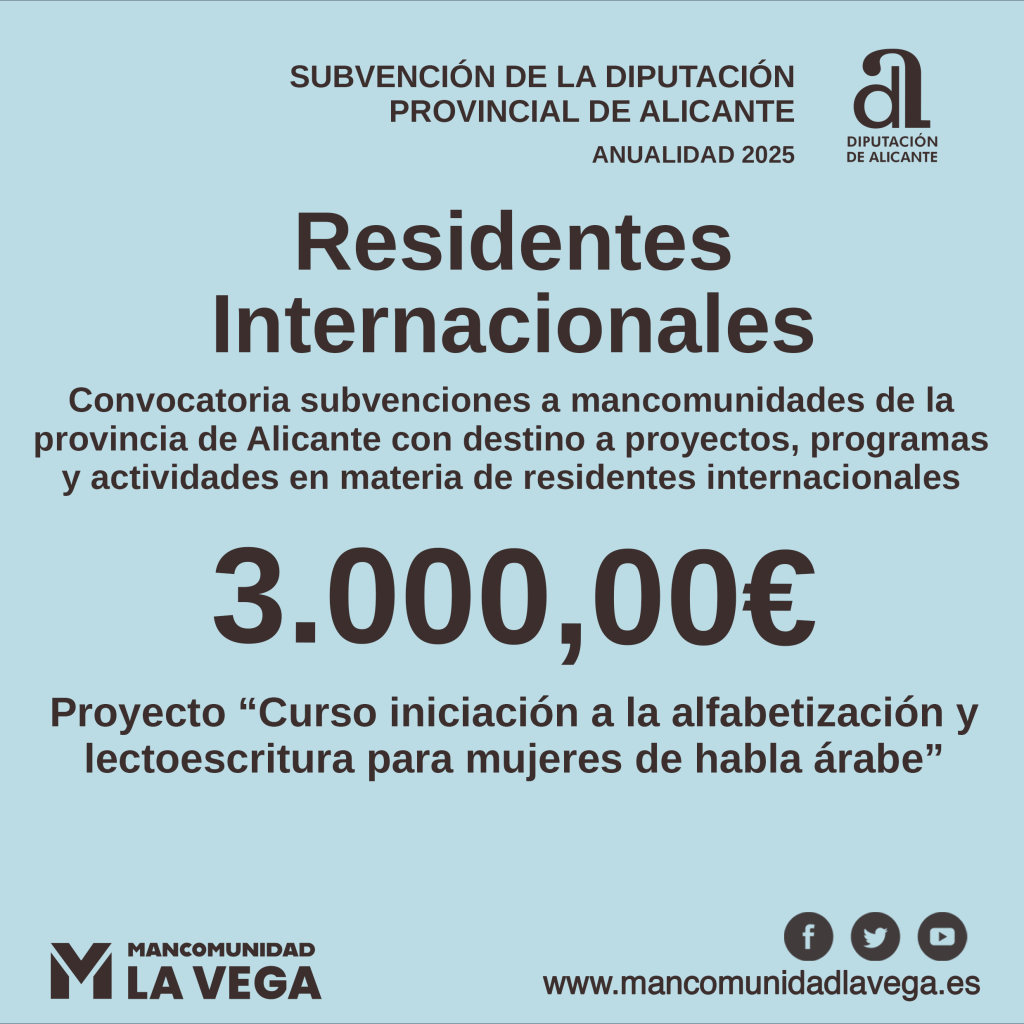 Se ha recibido una subvención de la Diputación de Alicante en la convocatoria de subvenciones a mancomunidades de la provincia de Alicante con destino a proyectos, programas y actividades en materia de residentes internacionales, anualidad 2025.2025-10-082025-10-08https://www.mancomunidadlavega.es/wp-content/uploads/2024/06/logomlv.pngMancomunidad la vegahttps://www.mancomunidadlavega.es/wp-content/uploads/2024/06/logomlv.png200px200px