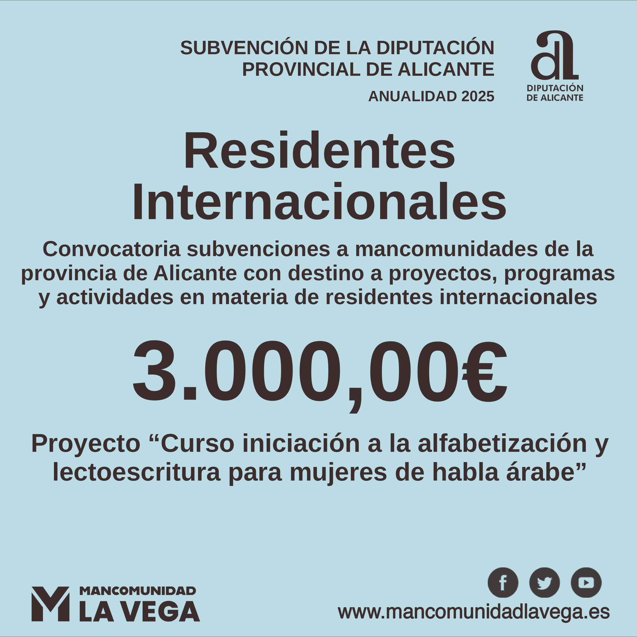 Se ha recibido una subvención de la Diputación de Alicante en la convocatoria de subvenciones a mancomunidades de la provincia de Alicante con destino a proyectos, programas y actividades en materia de residentes internacionales, anualidad 2025.