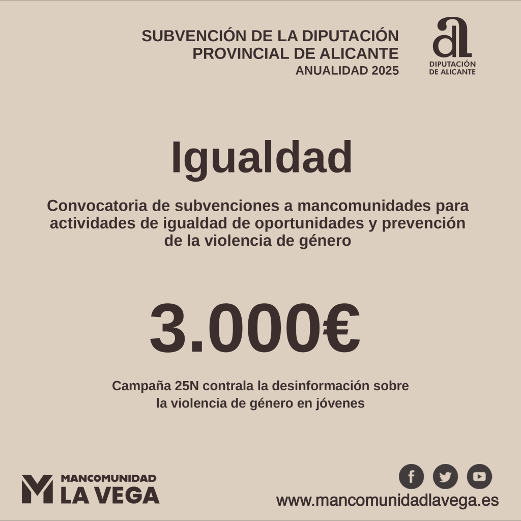 Portada » El Área de Igualdad de la Diputación de Alicante ha cocedido a Mancomunidad la Vega una subvención de 3.000€ para el proyecto Campaña #25N contra la desinformación sobre la violencia de género en jóvenes. Esta ayuda se enmarca en la convocatoria de subvenciones a mancomunidades para actividades de igualdad de oportunidades y prevención de la violencia de género, anualidad 2025.